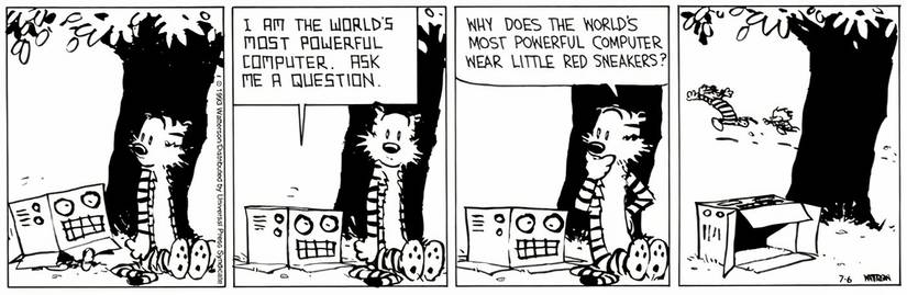 Si bien la mayoría de los inventos de Calvin son herramientas creadas para un propósito específico, la Computadora Más Poderosa del Mundo es en realidad más bien el alter ego de Calvin, alguien que es sorprendentemente violento. Cuando Calvin se presenta como la Computadora Más Poderosa del Mundo a Calvin (usando una caja de cartón sobre su cabeza con rasgos robóticos dibujados), afirma que puede responder cualquier pregunta. Entonces, Hobbes pregunta por qué la computadora más poderosa del mundo usa pequeñas zapatillas rojas, momento en el que Calvin arroja la caja de cartón de su cabeza y persigue a Hobbes..