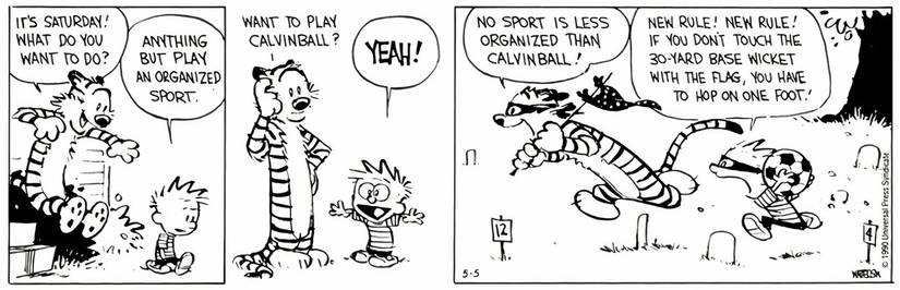 Los inventos de Calvin consisten principalmente en cajas de cartón decoradas que funcionan completamente en la imaginación de Calvin, como el Transmogrificador, el Duplicador y la máquina del tiempo. Sin embargo, este invento podría ser el más grande de todos, ya que es menos un “invento” y más una actividad deportiva completamente nueva: Calvinball. Las reglas del Calvinball son simples: el juego no se puede jugar de la misma manera dos veces.. Esto significa que el objetivo del juego cambia cada vez que se juega, e incluso mientras Calvin y Hobbes lo juegan, lo que lo convierte en una clase magistral de juego imaginario.