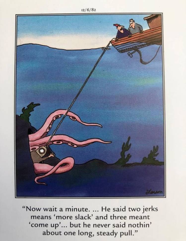 Este Lado lejano El cómic muestra a dos desafortunados marineros en un barco, preguntándose qué “un tirón largo y constante” en la cuerda significa de su buzo, Aunque sin que ellos lo sepan, un calamar gigante tiene al buzo atrapado bajo sus manos bajo el mar. No es necesario ser un experto en buceo en aguas profundas para darse cuenta de que el buceador se ha metido en una situación muy complicada, algo de lo que los dos marineros no se dan cuenta.