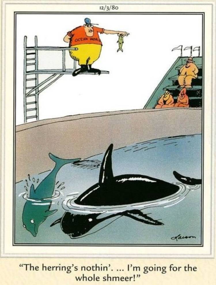 Lo que el entrenador no sabe es que no sólo repartirá la cena, sino que él será la cena; es un cómic un poco macabro, como ocurría a menudo con El otro ladocomo muestra Gary Larson que incluso los animales aparentemente más domesticados pueden tener un lado muy salvaje y, además, peligroso. De todos modos, el delfín no parece estar en gran desacuerdo con la ballena.