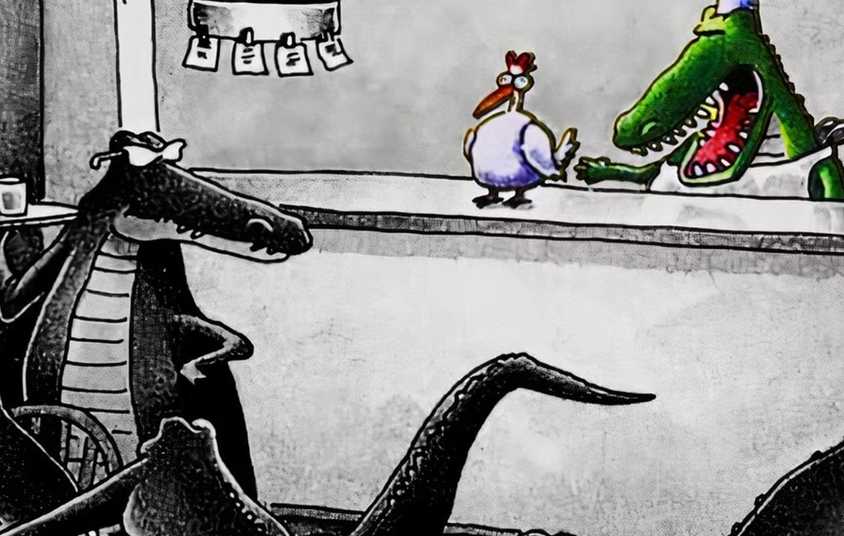 Cuando un reptil, ya sea un caimán o un cocodrilo, se acerca a la ventana de una pareja, Quieren zanjar el debate de una vez por todas para ver qué animal es en realidad, tomándose el tiempo para coger un libro que les ayude a descifrar la especie. No importa que el animal pueda atravesar la ventana y matarlos a ambos, es de suma importancia para ellos descubrir qué animal es realmente.
