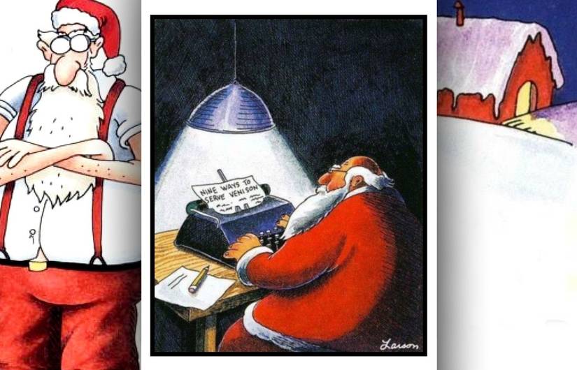 Fiel a su forma, Larson no puede resistirse a invertir la actitud alegre de Papá Noel, convirtiéndolo en un jefe mezquino que amenaza con convertir a sus fieles renos en su próxima comida si sus quejas no terminan. Para cualquier fanático que piense que está bromeando, lamentablemente otro. Lado lejano En la tira (abajo) se ve a Santa aparentemente componiendo una lista de recetas de venado: una para Dasher, Dancer, Prancer, Vixen, Comet, Cupid, Donner, Blitzen y Rudolph.