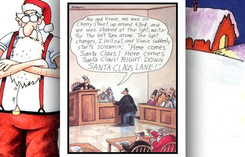 Lado lejanoLos personajes de verdad solo llegan una vez que han tenido un caso judicial desagradable. En esta tira, Larson hace que los acontecimientos de Gene Autry Aquí viene Papá Noel a una sombría realidad, cambiando la letra de una celebración de la inminente llegada de San Nicolás al desgarrador relato de Papá Noel atropellando a alguien en la calle.
