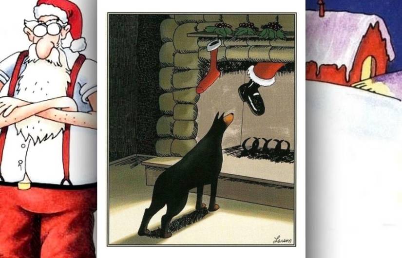 En esta tira cómica sin palabras, Santa se abre paso por la chimenea, sin saber aún que un dóberman alerta espera ansiosamente su llegada. Es una broma de Larson casi perfecta, con una sola imagen que captura el momento justo antes de que ocurra algo hilarantemente desastroso.