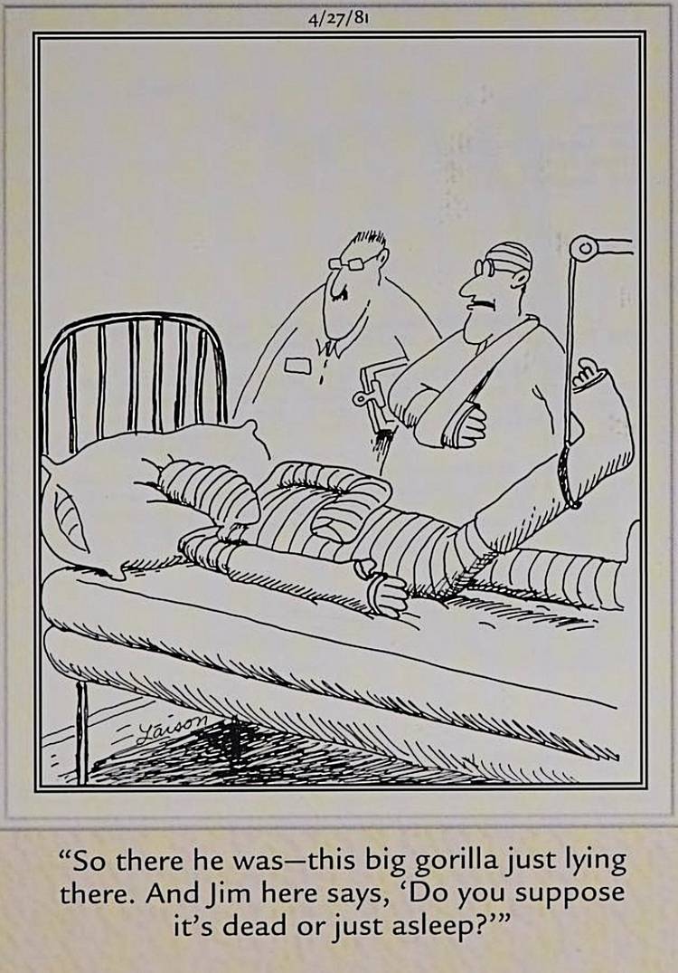 Es posible que un gorila no aparezca físicamente en este Lado lejano panel, pero es el quid de la broma, ya que la leyenda revela que el hombre, Jim, convaleciente con un yeso de pies a cabeza, fue atacado salvajemente por un gorila. De pie junto a él, su amigo (él mismo herido, en lo que el lector puede inferir que fue un intento de salvar a Jim, aunque no tan gravemente, ya que luce un cabestrillo y una cabeza vendada) le explica lo que le sucedió a un médico. “Así que allí estaba él, este gran gorila tirado allí.,“ el hombre revela, “y Jim dice: ‘¿Crees que está muerto o simplemente dormido?’”