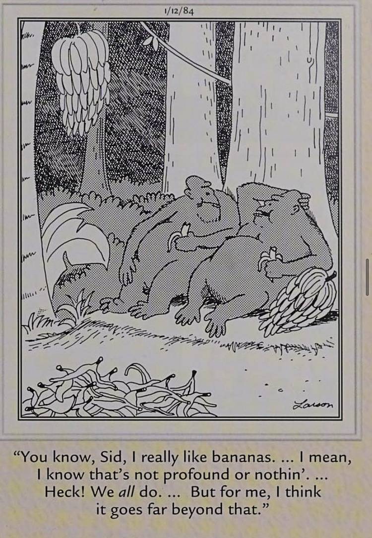 A pesar de lo absurdo superficial de poner estas palabras en boca de un gran simio, hablando de plátanos, una reflexión más profunda en este panel revela que es una de las representaciones más sorprendentes de Gary Larson sobre la vulnerabilidad real de un personaje.