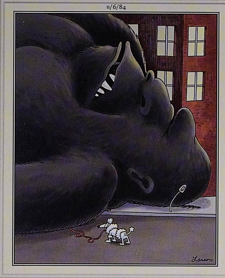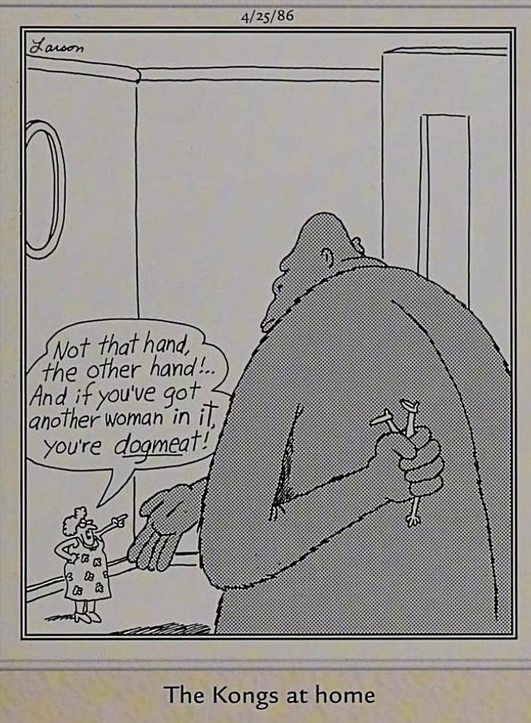 Con esta tira, Gary Larson recordó a los lectores del periódico una de las primeras y más emblemáticas historias de amor condenadas al fracaso del cine: el deseo no correspondido de King Kong por el personaje de Fay Wray en la película de 1933. rey kong, que presentó al famoso simio gigante. Aquí, Larson ofrece una interpretación tonta de cuál podría haber sido su perspectiva a largo plazo como pareja.mientras Kong intenta ocultar su infidelidad, literalmente, agarrando a una pobre mujer en su mano detrás de su espalda, mientras su esposa exige verla y exclama: “Y si tienes otra mujer, ¡eres carne de perro!”