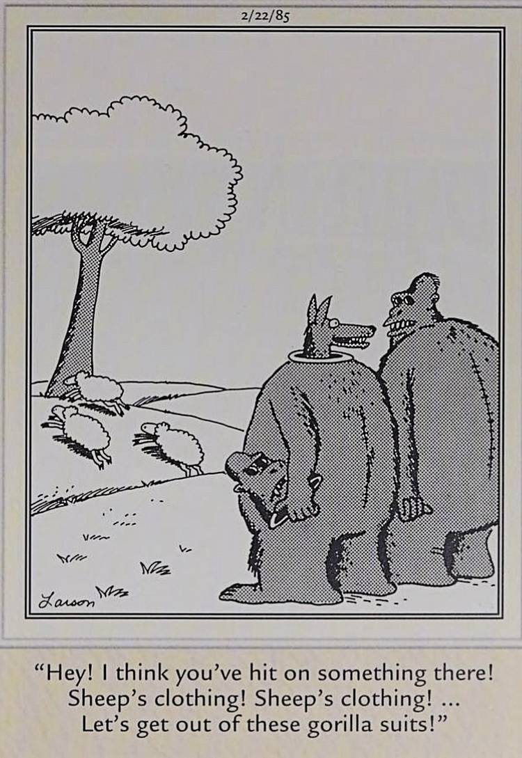 Esta entrada no es sólo una de las más divertidas. Lado lejano Los paneles presentan gorilas, pero uno de los chistes más divertidos de la tira en general. Gary Larson describe en broma el momento en que dos lobos tuvieron la idea de infiltrarse en un rebaño de ovejas haciéndose pasar por ovejas, dando origen al famoso modismo. Lo hace mostrando dos lobos disfrazados de gorila., viendo a las ovejas huir de ellos atemorizadas. Después de haber probado en versión beta la idea de usar disfraces para acercarse a las ovejas, proceden a afinar la idea y se dan cuenta de que lo que realmente necesitan es “¡ropa de oveja! ¡Ropa de oveja!”.