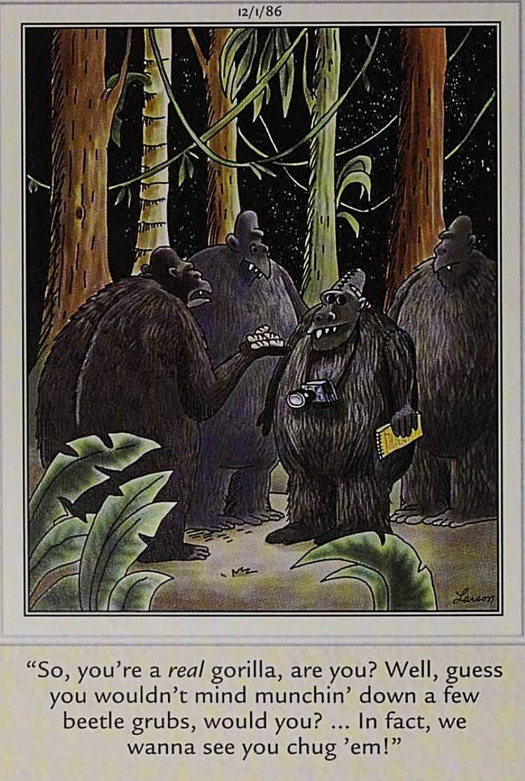 Evidentemente, los gorilas estaban en la mente de Gary Larson cuando 1986 llegaba a su fin, ya que dos de sus más divertidos Lado lejano Los paneles que mostraban grandes simios se publicaron con unos días de diferencia. El segundo de ellos fue uno de los familiares interrogatorios del lenguaje de Larson, cuando cuestionó qué significa exactamente el peso específico del gorila en el chiste sobre el gorila de quinientas libras para el remate. El chiste dice así: