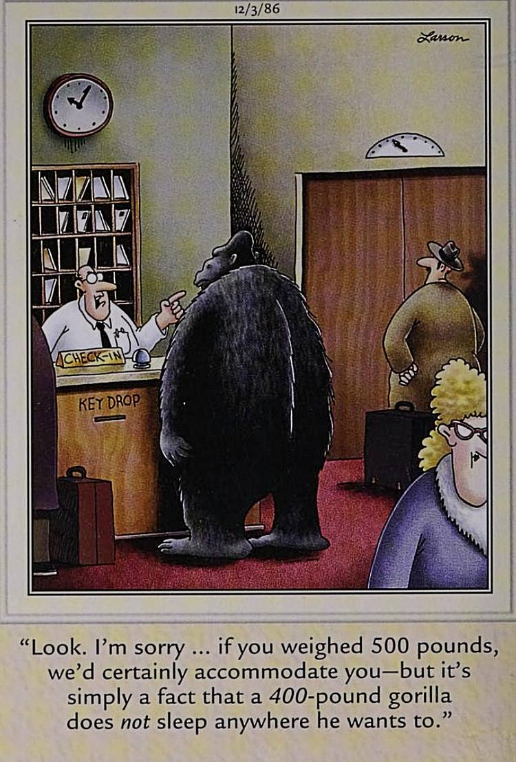 Larson pone a prueba esta ocurrencia retratando a un gorila de 400 libras (todavía, según todos los indicios, un animal enorme e intimidante) totalmente bloqueado en la recepción de un hotel, en una de sus deconstrucciones del lenguaje más divertidas.