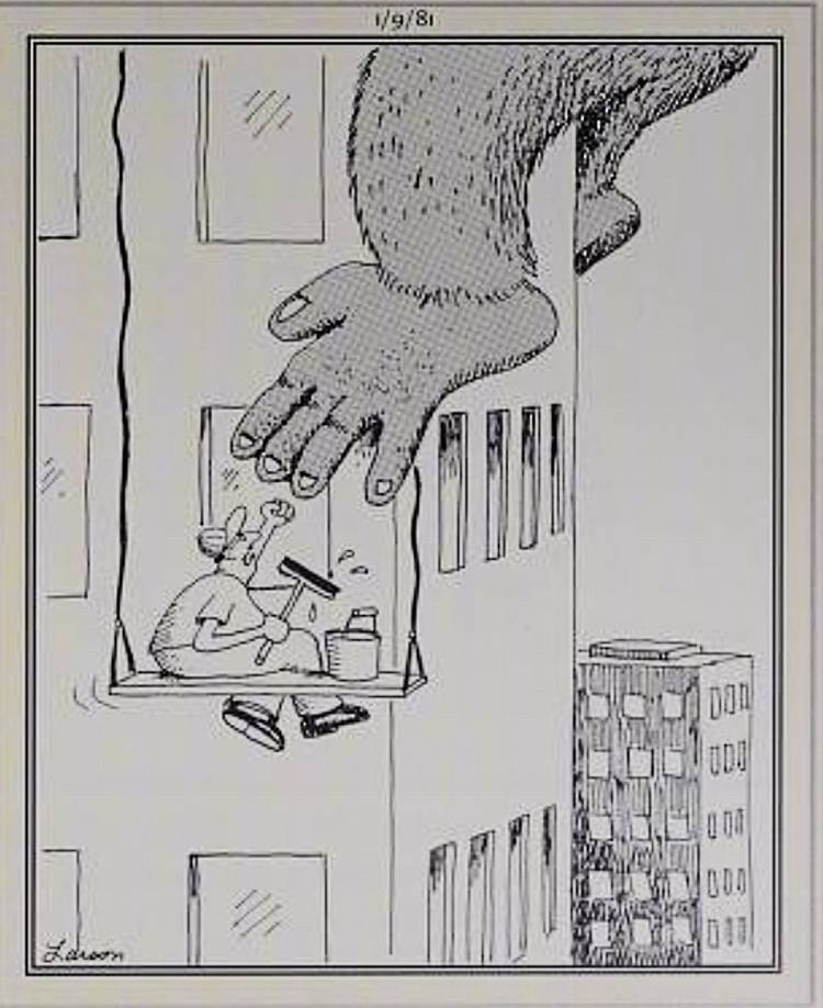 En esto Lado lejano En el panel, la diversión proviene de la descripción que hace Gary Larson de un simio gigante como una molestia, en lugar de una fuerza destructiva. Aquí, un limpiador de ventanas en un andamio, colgado del costado de un rascacielos, Agita el puño con consternación cuando los dedos del gran simio oscurecen la prístina vista a través de la ventana que acaba de limpiar minuciosamente. En lugar de preocuparse por su seguridad, el hombre responde como lo haría cualquiera si alguien tocara sus ventanas recién lavadas: con frustración porque tendrá que lavarlas nuevamente.