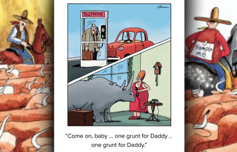 El simple gag de reemplazar una mascota doméstica de tamaño regular con un rinoceronte gigante y malhumorado es manejado magistralmente por Larson, quien, mientras se involucra con el mismo concepto central, siempre encuentra una manera de hacerlo sentir nuevo, desde rinocerontes corriendo a través de gigantescos tubos de hámster hasta una representación de Francis Barraud. La voz de su amopero esta vez con un rinoceronte reemplazando a su terrier (o más bien sentado encima de él).