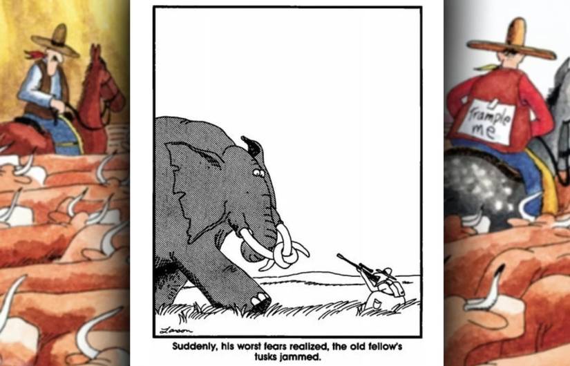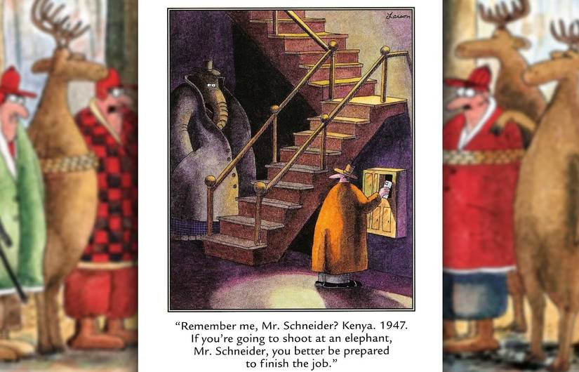 En otro gag sobre “mamíferos gigantes”, Larson describe un enfrentamiento entre un cazador y un elefante en el que los colmillos del paquidermo se “atascan” de repente, lo que permite al cazador un tiro limpio. Es un gag clásico de inversión de circunstancias, pero también el raro Lado lejano chiste donde un cazador gana sobre su presa. Larson es un gran defensor de las organizaciones benéficas de conservación y generalmente se pone del lado de los animales contra la humanidad. Afortunadamente, para cualquier Lado lejano Para los fanáticos que no quieren imaginar el espantoso destino del elefante, una tira posterior ofrece la esperanza de que él se rió el último: