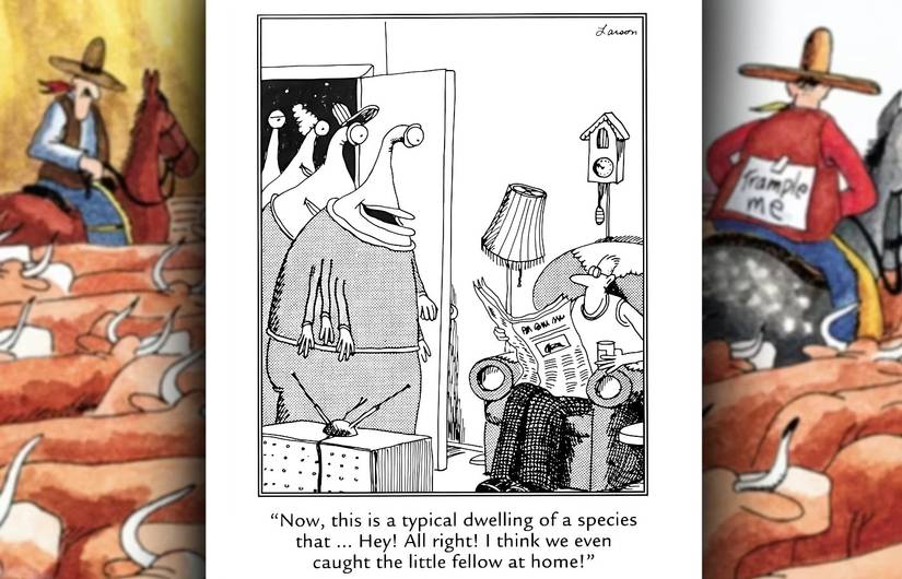 A Larson le encanta tomar un modismo o una letra literalmente, creando un mundo extraño donde un “cerdito” en el pie de un hombre dormido puede soltarse y salir volando. “al mercado.” Porque El lado lejano cuenta sus gags en un solo panel (al menos la mayor parte del tiempo), Larson aprovecha cada oportunidad para utilizar un personaje o una situación que tenga un contexto cultural existente.lo que le permite incluir más cosas en el chiste (y le proporciona un montón de ideas y suposiciones contra las cuales jugar).