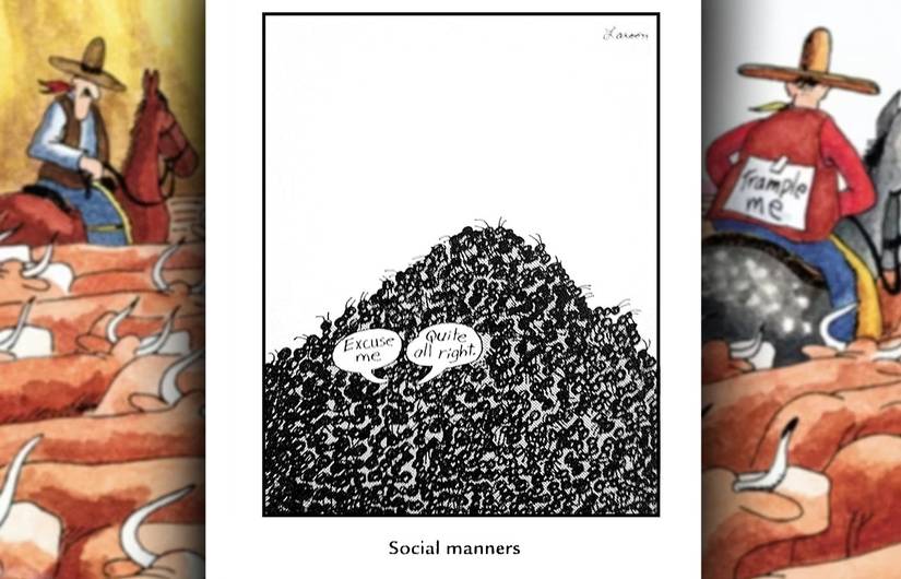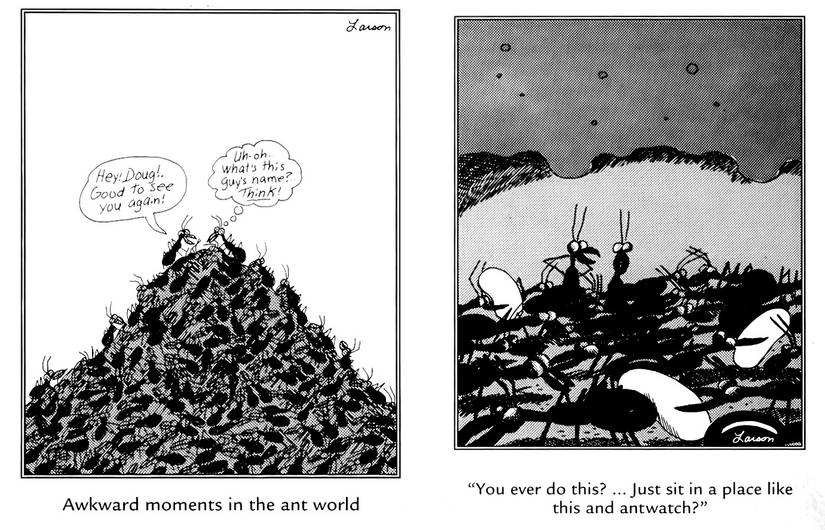 Los animales vuelven a tomar el mando: dos hormigas, en medio de un enjambre gigantesco de sus compañeras de trabajo, aún encuentran tiempo para observar las cortesías sociales. Larson utilizó mucho a las hormigas, a menudo apelando a la idea de que viven en una especie de carrera de ratas de insectos que parece familiar, con muchas de las mismas preocupaciones y pensamientos casuales.