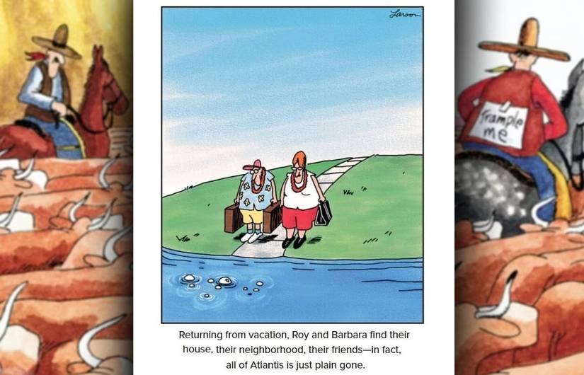 El lado lejano Larson incursiona en la mitología con este gag, en el que dos turistas regresan a su casa en Atlantis y descubren que toda la ciudad ha desaparecido bajo el agua. A Larson le encanta restar importancia a los grandes acontecimientos, convirtiendo el hundimiento de una ciudad entera en un inconveniente surrealista para Roy y Barbara. Aún más divertido, el gag está claramente ambientado en la época actual, con un camino pavimentado que conduce a la ciudad perdida.