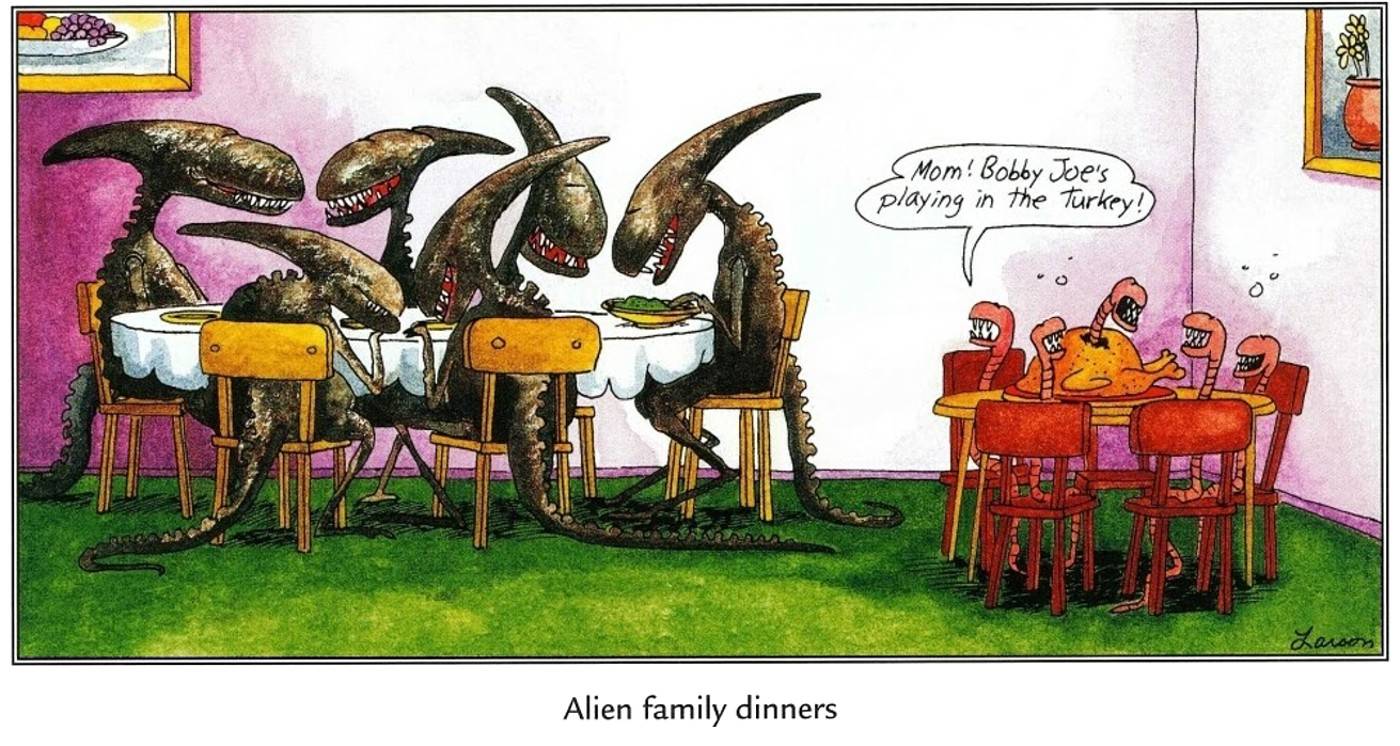 • El humor de Far Side hace que los monstruos icónicos de las películas sean más accesibles, como los Xenomorfos más alegres (sin embargo,