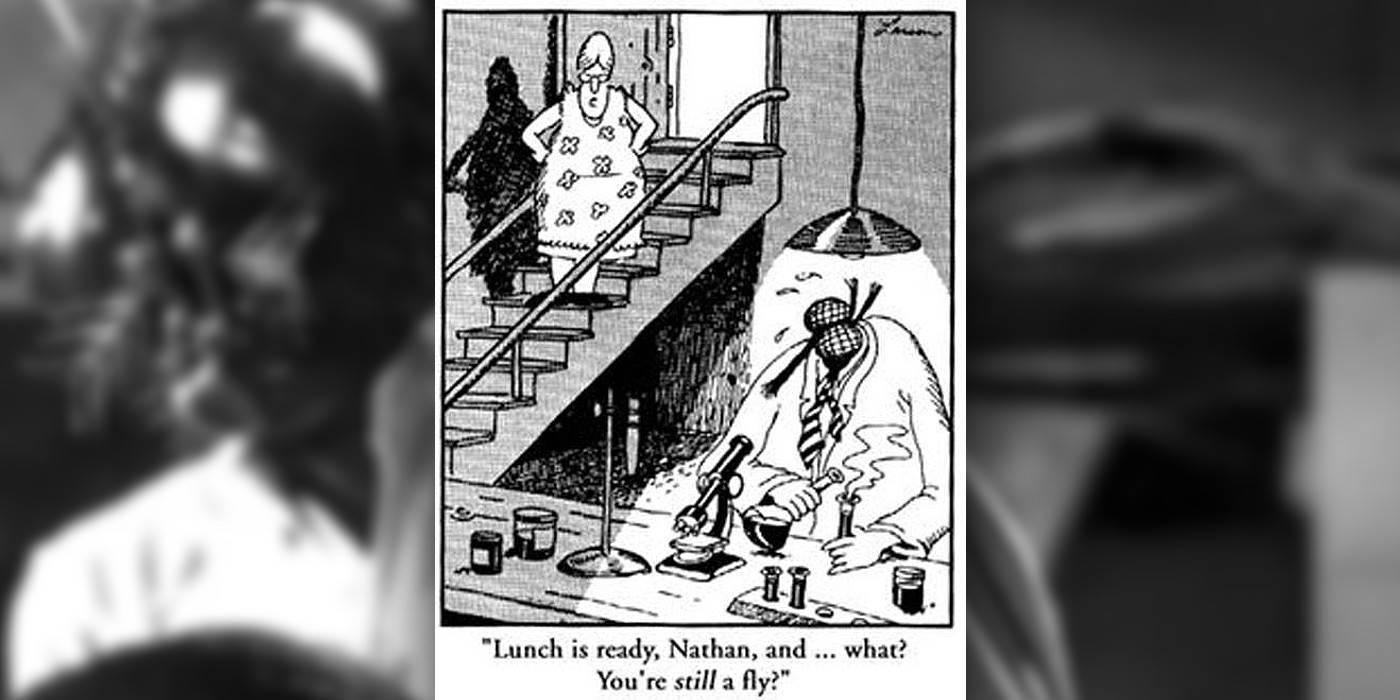 En un giro accidental pero divertido, Larson otro El cómic que hace referencia a la mosca aparentemente muestra la misma situación desde una perspectiva diferente., ya que esta vez es el propio científico quien ha sufrido una transformación insectoide. Con suerte, cuando descubra una cura, cruzará la calle para ayudar a George también.