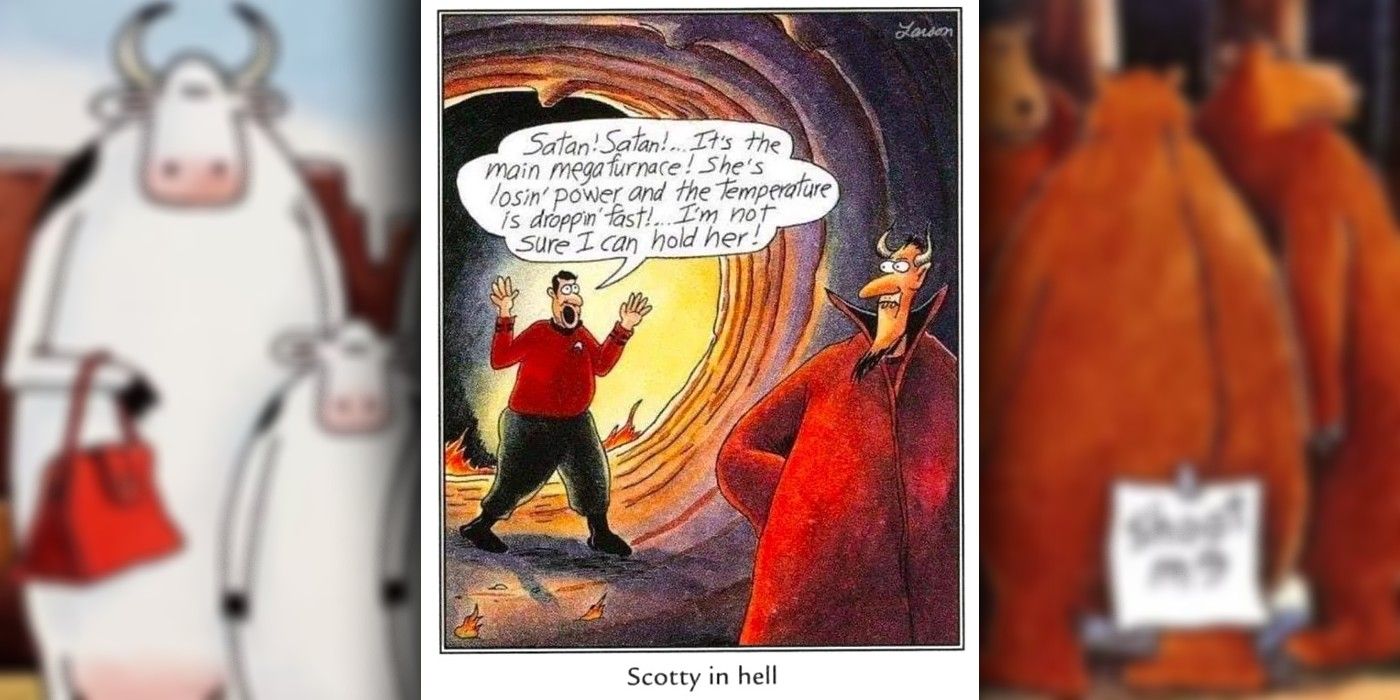 Dado el número de Lado lejano cómics sobre astronautas y extraterrestres, los fanáticos pueden esperar que Gary Larson tenga mucho que decir sobre Star Trek, sin embargo, creó muy pocos cómics sobre el gigante cultural. Posiblemente lo mejor es ver a Montgomery “Scotty” Scott, también conocido como el Hacedor de Milagros, enviado al infierno, donde sus icónicas advertencias sobre el EmpresaLos motores ahora se aplican al ‘megahorno’ que aparentemente es necesario para mantener el inframundo tan increíblemente caliente.