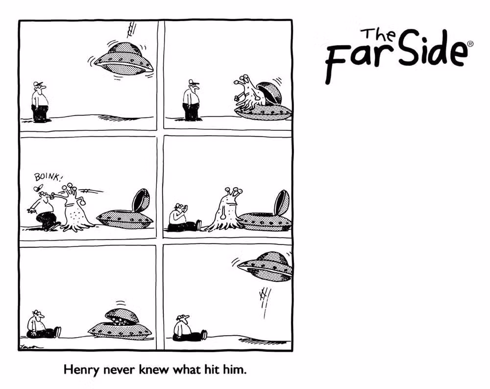 En un raro panel múltiple Lado lejano cómico, Larson presenta un chiste increíblemente simple, haciendo un juego de palabras con un modismo común. “Nunca supe qué lo golpeó” generalmente significa que no viste venir algo, pero en el caso de Henry, literalmente no tiene idea de qué especie era su atacante.