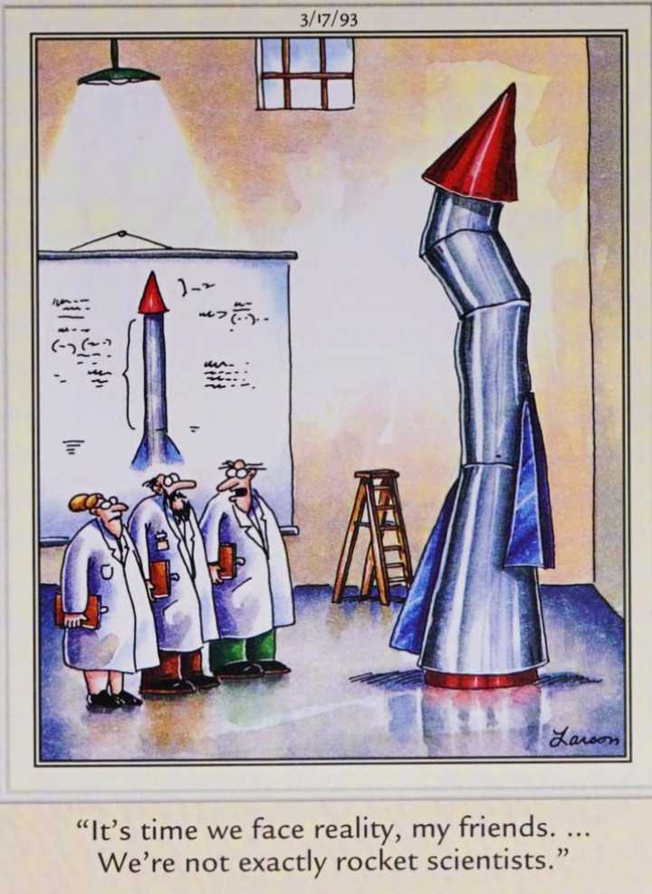 A Larson le encanta tomar una frase común literalmente, y aquí construye su broma en torno a la idea de que cualquier cosa descrita como “No es exactamente ciencia espacial” es sencillo. Larson invierte la lógica, haciendo que algunas personas normales intenten construir un cohete y fracasen… o eso parece.