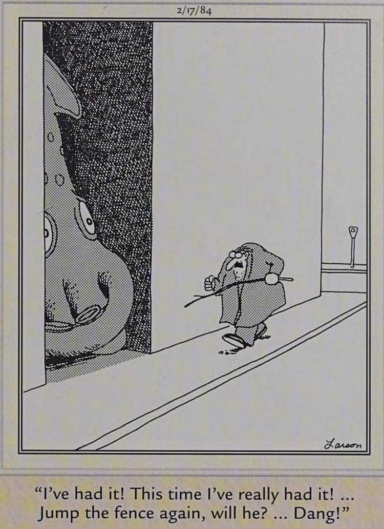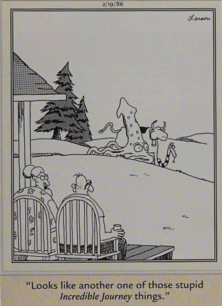 Gary Larson Lado lejano era famoso por utilizar regularmente animales como personajes centrales, sobre todo como resultado de la aparente obsesión de Larson por las vacas y su fijación por las serpientes. este panel se burla conscientemente de sus criaturas recurrentes, mientras un calamar, una serpiente y una vaca se unen para algún tipo de búsqueda épica.. Lo que hace que este panel sea grandioso es la forma en que Larson encuadra a este trío en la distancia, visto por una pareja humana de edad avanzada en su porche delantero, como señala uno de ellos, con El lado lejano ingenio mordaz familiar: “Parece otra de esas cosas estúpidas de Incredible Journey.“