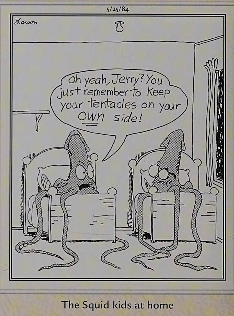 Este tonto Lado lejano El panel de calamar toma las disputas familiares de los hermanos adolescentes que comparten un dormitorio y traslada las criaturas marinas resbaladizas y con tentáculos a la situación. “Solo recuerda mantener tus tentáculos de tu lado.“, le grita un calamar joven a su hermano Jerry., quien le devuelve una mirada de consternación. Como ocurre con muchos de los mejores. Lado lejano En las tiras cómicas, el comportamiento humano se satiriza ingeniosamente mediante el uso de animales. En particular, el simple título: “los niños calamares en casa” – acentúa el chiste aquí, subrayando su remate absurdo al igual que el diálogo del niño calamar está subrayado, para enfatizar.