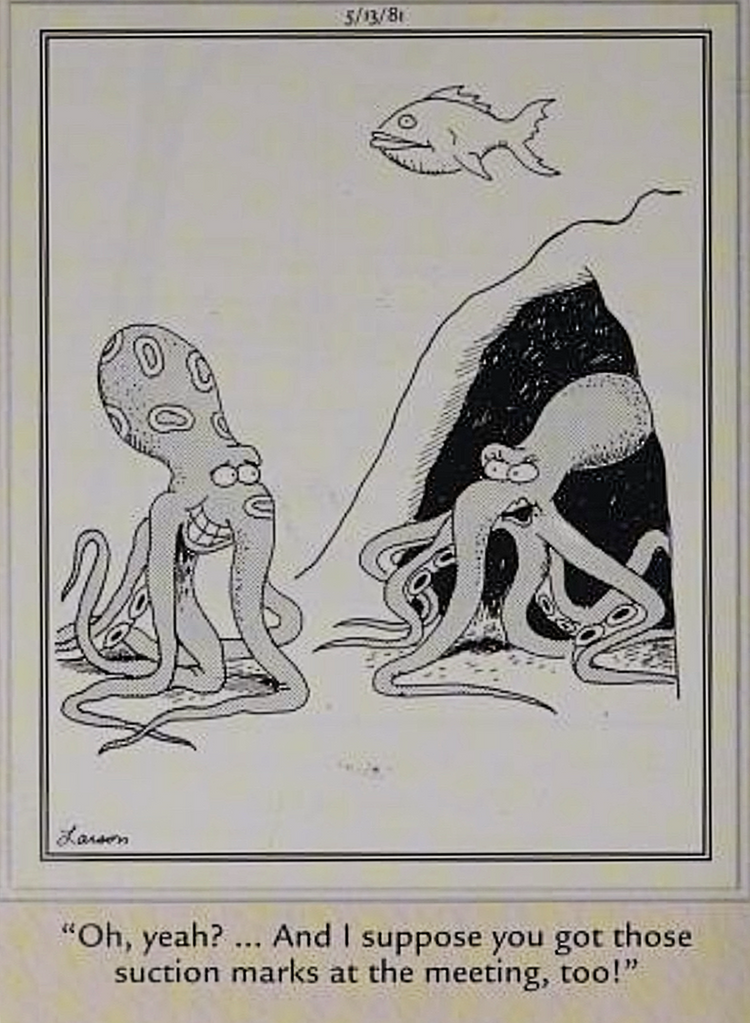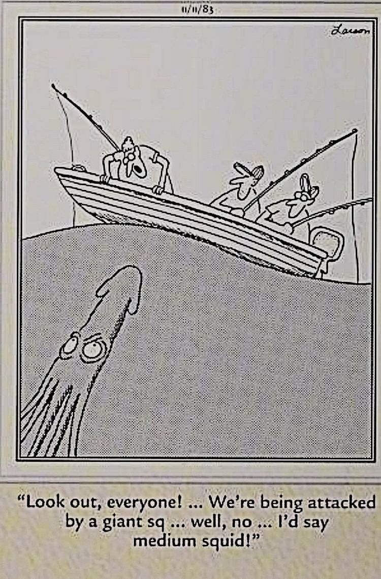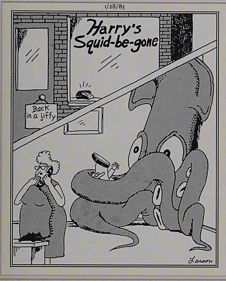 a menudo presentaba calamares gigantes, ya que Gary Larson consideró acertadamente que era el tipo de calamar más divertido del mar. Este panel destacado satiriza su propia tendencia y los resultados son divertidísimos.