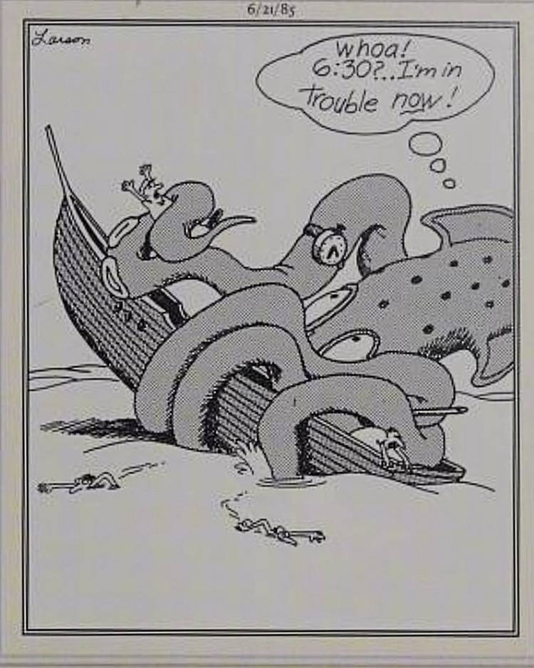 Aquí, la naturaleza destructiva de El lado lejano El calamar gigante se compensa con uno de los chistes más tontos de Gary Larson. Por supuesto, Larson solo podría haber representado un animal con múltiples apéndices durante un tiempo sin dibujarlo mirando su reloj al menos una vez., como es el caso aquí. Mientras envuelve y hunde un barco, el calamar gigante ve el reloj en uno de sus tentáculos y piensa: “¡Vaya! 6:30? ¡Estoy en problemas ahora!” Adónde debe llegar el calamar, o para qué llega tarde, queda hilarantemente en manos de El lado lejano lectores a imaginar.