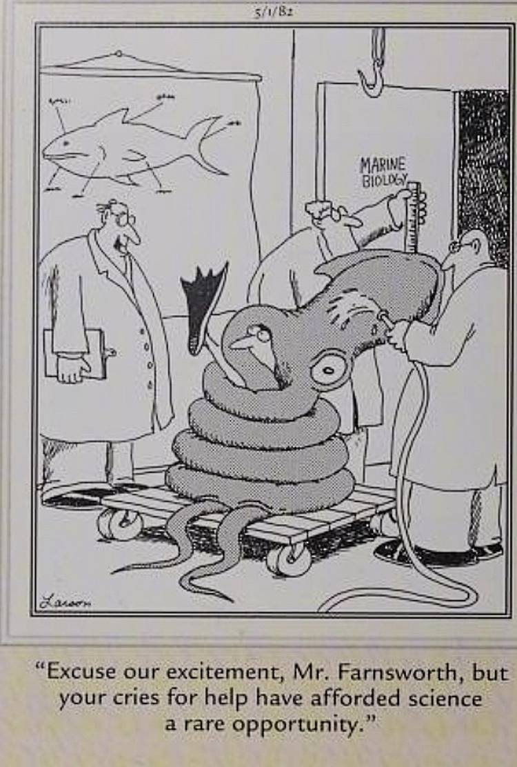 Este Lado lejano El panel de calamares está anclado por la imagen humorística de un hombre con un calamar gigante enrollado a su alrededor, pero la verdadera comedia proviene del contexto, ya que este “Sr. Farnsworth” ha sido rescatado por un grupo de biólogos marinos, cuya motivación principal es estudiar el calamar, en lugar de liberar al buzo con shock. Mientras el calamar entrecierra los ojos consternado, los científicos lo miden, lo limpian con una manguera y se preparan con entusiasmo para el “rara oportunidad” para estudiar la criatura de las profundidades marinas que ofrece el encuentro fortuito de Farnsworth.