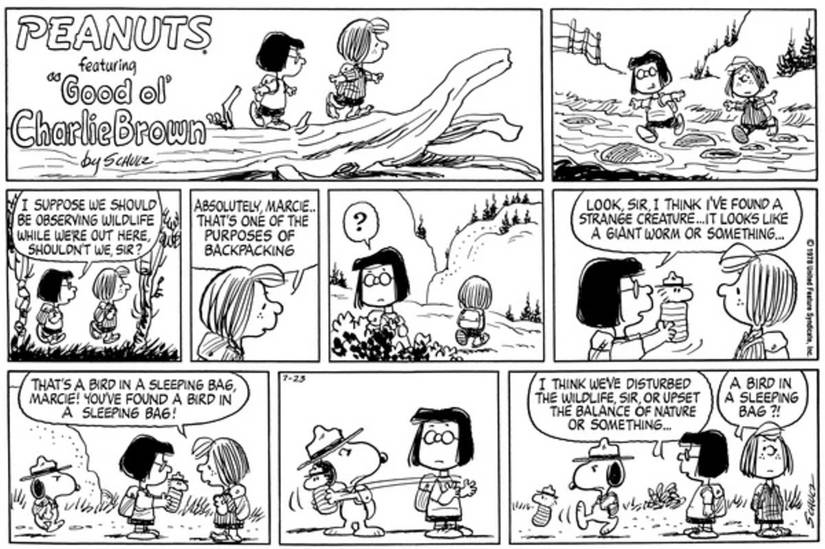 Snoopy no está muy contento de ver a uno de sus exploradores en esa situación, y le da patadas al pajarito para que siga avanzando. Por más tranquilo que pueda ser Snoopy cuando está solo, Es bastante irascible cuando está con sus Beagle Scouts.Los exploradores de Snoopy son un poco peculiares y hacen cosas que podrían considerarse un poco raras. Quedarse atrapados en su saco de dormir es solo un ejemplo de las cualidades más excéntricas de los exploradores.