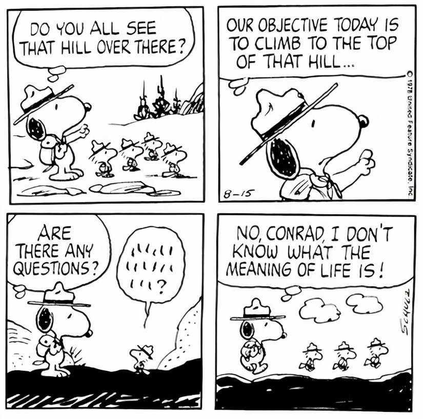 Desafortunadamente para Snoopy, cuando le pregunta al grupo si alguien tiene alguna pregunta sobre su ascenso a la colina, Un explorador, Conrad, se desvía del tema y pregunta cuál es el significado de la vida. Snoopy no tiene mucha paciencia con la pregunta filosófica de Conrad, y le grita que no conoce el sentido de la vida. A Conrad no le interesan demasiado los objetivos de la salida a la naturaleza, sino que lo consumen más ideas y preguntas existenciales.