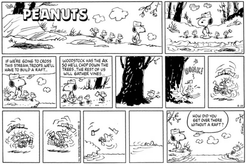 Como resultado, cuando intenta cortar un enorme tronco de árbol, el impacto es tan fuerte que lo hace tambalearse hacia atrás, hacia el agua. y hasta el otro lado. Snoopy, que se perdió el espectáculo, se sorprende y se queda perplejo al ver cómo Woodstock pudo cruzar el arroyo sin balsa. Los exploradores suelen hacer cosas que desconciertan a Snoopy, y la forma poco ortodoxa de Woodstock de cruzar el agua es una de ellas.