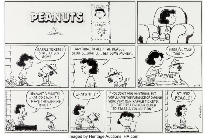 Por lo general, comprar un boleto de rifa le da a alguien la oportunidad de ganar algo de una organización o caridad como agradecimiento por hacer una donación. Las cosas son un poco diferentes cuando está involucrado Snoopy. Al ir de puerta en puerta pidiendo donaciones para los Beagle Scouts a través de boletos de rifa, Lucy se muestra sorprendentemente entusiasmada por ayudar. Sin embargo, su entusiasmo disminuye cuando le pregunta a Snoopy qué puede obtener si tiene el boleto ganador de la rifa, y Snoopy le responde que no obtendrá nada incluso con un boleto ganador.