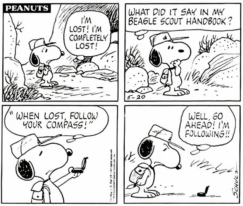Snoopy, piensa que significa que la brújula lo sacará de estar perdido, por lo que espera con impaciencia a que la brújula comience a moverse. y le grita como resultado. El hecho de que Snoopy crea que la brújula lo sacó del bosque, En lugar de tener que descifrar la dirección correcta mirándola.hace que las desventuras de los Beagle Scouts tengan mucho más sentido.