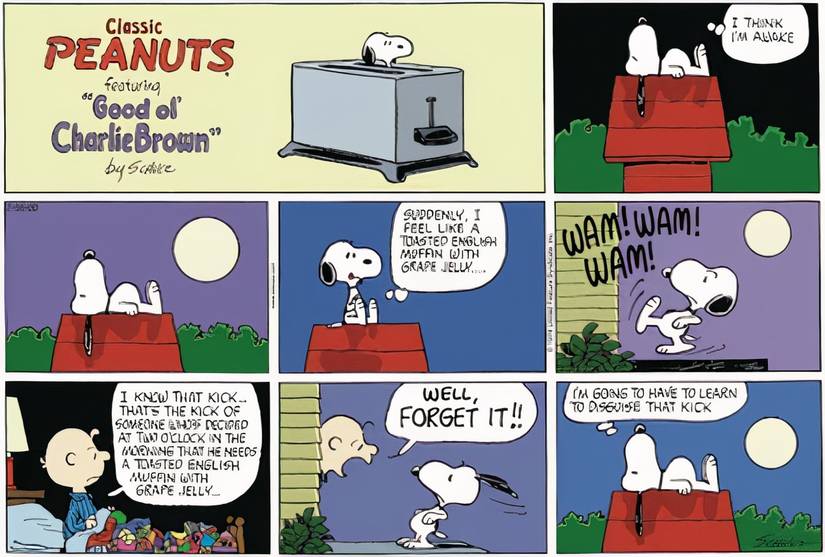 Al parecer, Snoopy tiene tantas ganas de comer muffins con mermelada de uva que tiene una forma específica de patear la puerta cada vez que quiere uno. y Charlie Brown se sabe ese sonido de memoriaChuck supo inmediatamente lo que significaba la patada de Snoopy y le dijo que no le daría un panecillo a las dos de la mañana. Snoopy piensa que necesita disimular esa patada, ya que Charlie Brown lo conoce demasiado bien.