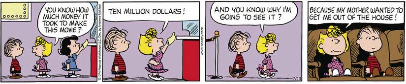La situación en la que se encuentran Sally, Linus y Lucy es universal, ya que Las mamás aparentemente siempre han enviado a sus hijos al cine durante las vacaciones de verano en un esfuerzo por sacarlos de casa por unas horas.En otras palabras, esos éxitos de taquilla que han costado millones de dólares posiblemente tengan que agradecerles a los padres (en este caso, a las madres) por su éxito.