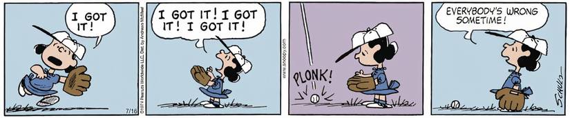 Durante un partido de béisbol, Lucy ve una pelota que se dirige hacia ella. Ella llama a la pelota para que nadie más de su equipo se interponga en su camino mientras intenta atraparla. Una y otra vez, Lucy grita: “¡Lo tengo!” pero se pierde por completo la captura. Lucy luego dice: “¡Todo el mundo se equivoca alguna vez!” Lucy se equivocó acerca de poder atrapar la pelota, pero Al decir que todos se equivocan a veces, de repente tiene razón acerca de estar equivocada..