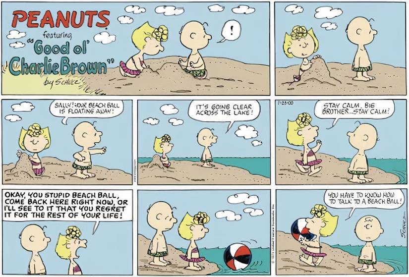 Cuando Charlie Brown le dice a Sally que su pelota de playa está flotando en el lago, ella le dice que no se preocupe y simplemente llama a la pelota para que vuelva. Sally le dice a Charlie Brown:Tienes que saber hablarle a una pelota de playa.“, algo que Charlie Brown claramente no sabía cómo hacer. En otras palabras, Charlie Brown ni siquiera puede ir a la playa sin hacer algo malo.