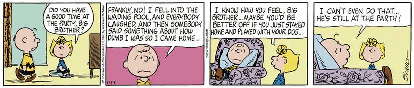 Una noche, Chuck entra a su casa con cara de tristeza y Sally le pregunta por qué no está en la fiesta. Charlie Brown le dice que acaba de humillarse delante de todos sus amigos, por lo que decidió irse temprano. Sally, tratando de animarlo, le dice que al menos puede pasar el resto de la noche con Snoopy. Sin embargo, Charlie Brown le dice:¡Él todavía está en la fiesta!“.