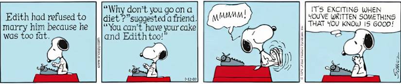 Snoopy ha sido durante mucho tiempo un aspirante a novelista, escribiendo a máquina mientras estaba sentado en la parte superior de su caseta de perro durante muchos años. Miseria historia, Y en esta tira cómica escribe algo verdaderamente magnífico.. Al menos, eso cree él. Snoopy está escribiendo una historia sobre una mujer llamada Edith que se niega a casarse con alguien debido a su peso, y esa persona acude a su amigo, quien le pregunta por qué no puede simplemente ponerse a dieta antes de decir: “¡No puedes tener tu pastel y a Edith también!“.