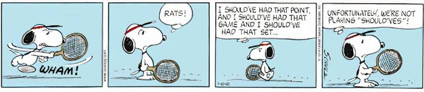 Durante un partido de tenis individual, Snoopy se frustra por su forma de jugar. No deja de pensar en todas las cosas que “debería” haber hecho durante el partido y en todas las formas en que podría haber mejorado su juego. Pero entonces, Antes de perder la concentración por completo, Snoopy se recupera y dice: “¡No estamos jugando a los ‘deberíamos’!“.
