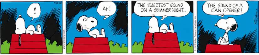 Parece que Snoopy es el más “comedor” cuando debería estar dormido, algo que los fans ya han visto antes cuando llamó a la puerta de Charlie Brown intentando conseguir un panecillo de gelatina. En este cómic, Snoopy experimenta el mismo nivel de hambre en mitad de la noche mientras está tumbado encima de su caseta de perro. En lugar de disfrutar de la atmósfera de una tranquila noche de verano, con todos los sonidos naturales que ofrece, Snoopy está concentrado en el sonido de un abrelatas en algún lugar a lo lejos, y de inmediato se anima, seguramente para ir a pedirle a Charlie Brown algo de comida..