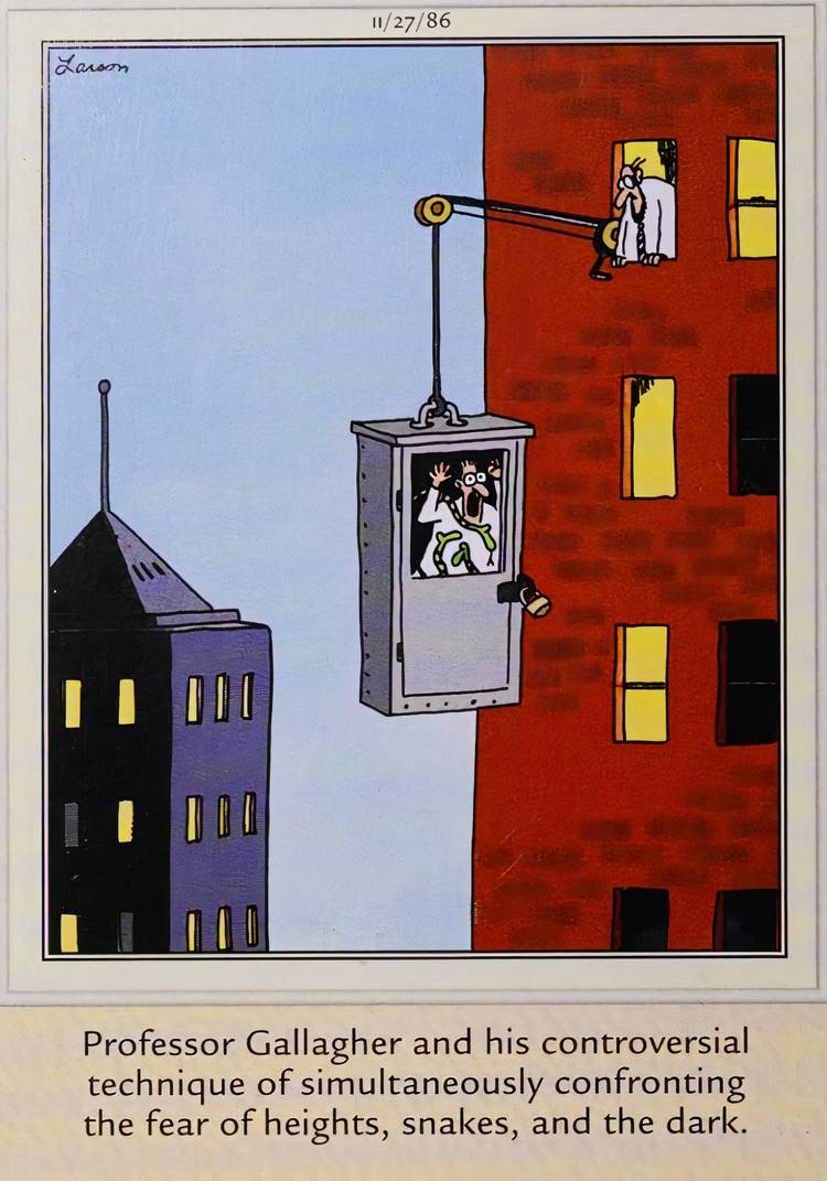 Esta caricatura rompe casi por completo con la Lado lejano Premisa del “consultorio del terapeuta”, pero es demasiado escandalosa para no incluirla aquí. Representa a un hombre en una caja de metal, cubierto de serpientes, suspendido de la ventana de un edificio de gran altura, con la leyenda que explica que se trata de: “El profesor Gallagher y su controvertida técnica de afrontar simultáneamente el miedo a las alturas, a las serpientes y a la oscuridad“.