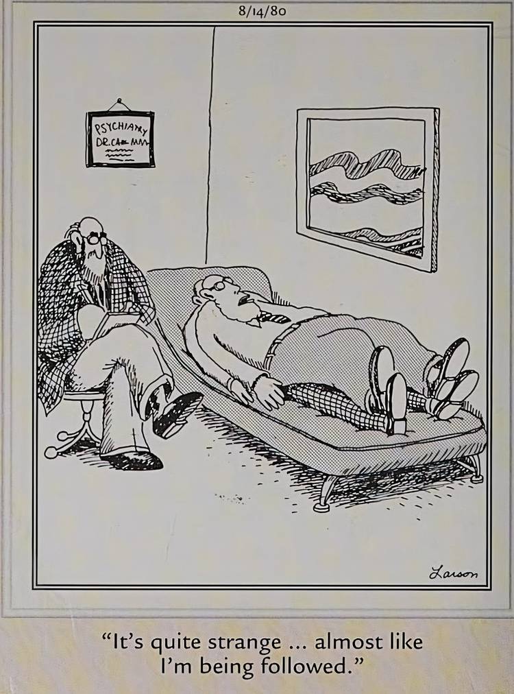 en uno de El lado lejano Los primeros paneles del “consultorio del terapeuta”, un hombre se acuesta en el sofá de la oficina y dice: “Es bastante extraño… casi como si me estuvieran siguiendo.“, ya que se ve claramente la silueta de un segundo hombre debajo de él en el sofá. Este es exactamente el tipo de remate extraño con el que Gary Larson se hizo famoso como humorista, y sentó un fuerte precedente para los chistes sobre terapia que seguirían en los años venideros.