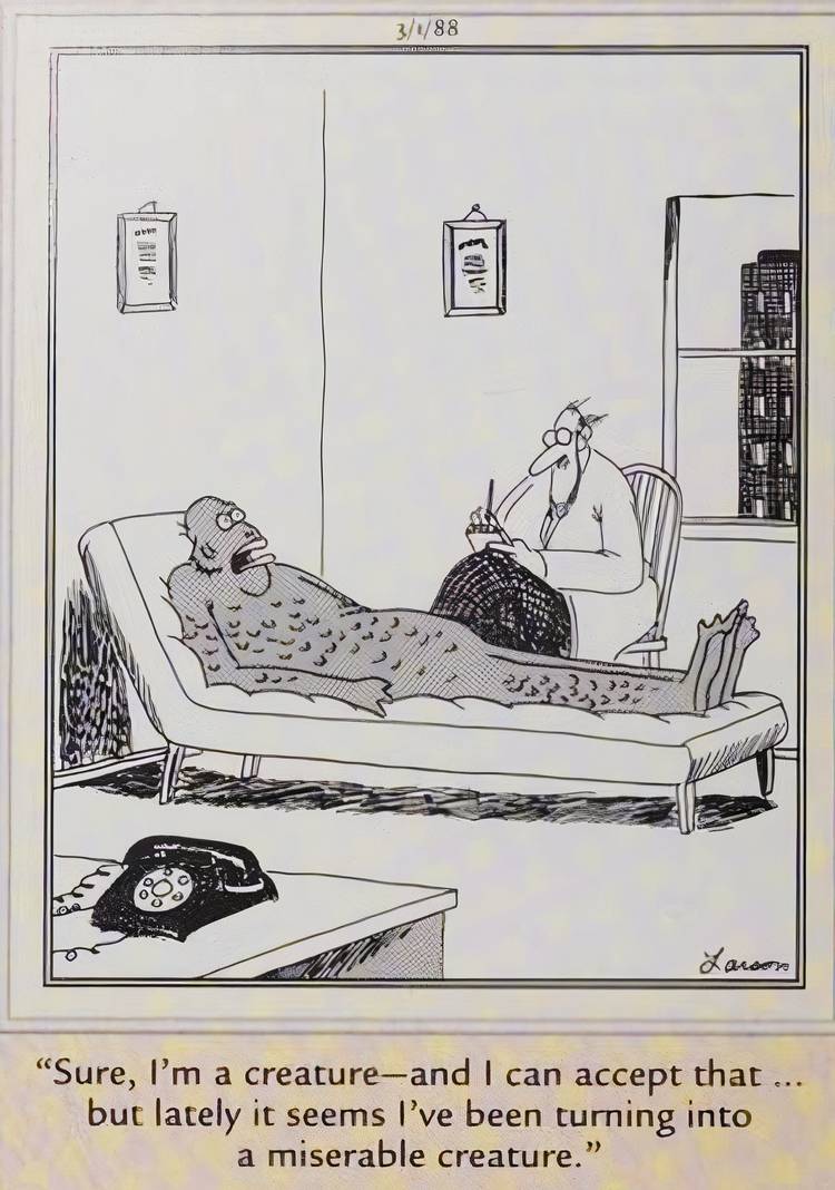 “Claro, soy una criatura y puedo aceptarlo.“, dice el paciente, “pero últimamente parece que me he convertido en una criatura miserable.” Este comentario de la criatura, de que puede aceptar lo que es, pero no en quién se está convirtiendo, expresa una clara familiaridad con el análisis psicológico y una disposición hacia la introspección, lo que sugiere que en esta caricatura, Gary Larson estaba expresando una personalidad muy real. sentimiento en forma cómica.