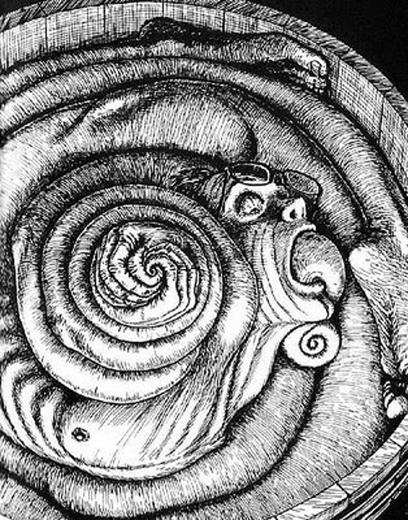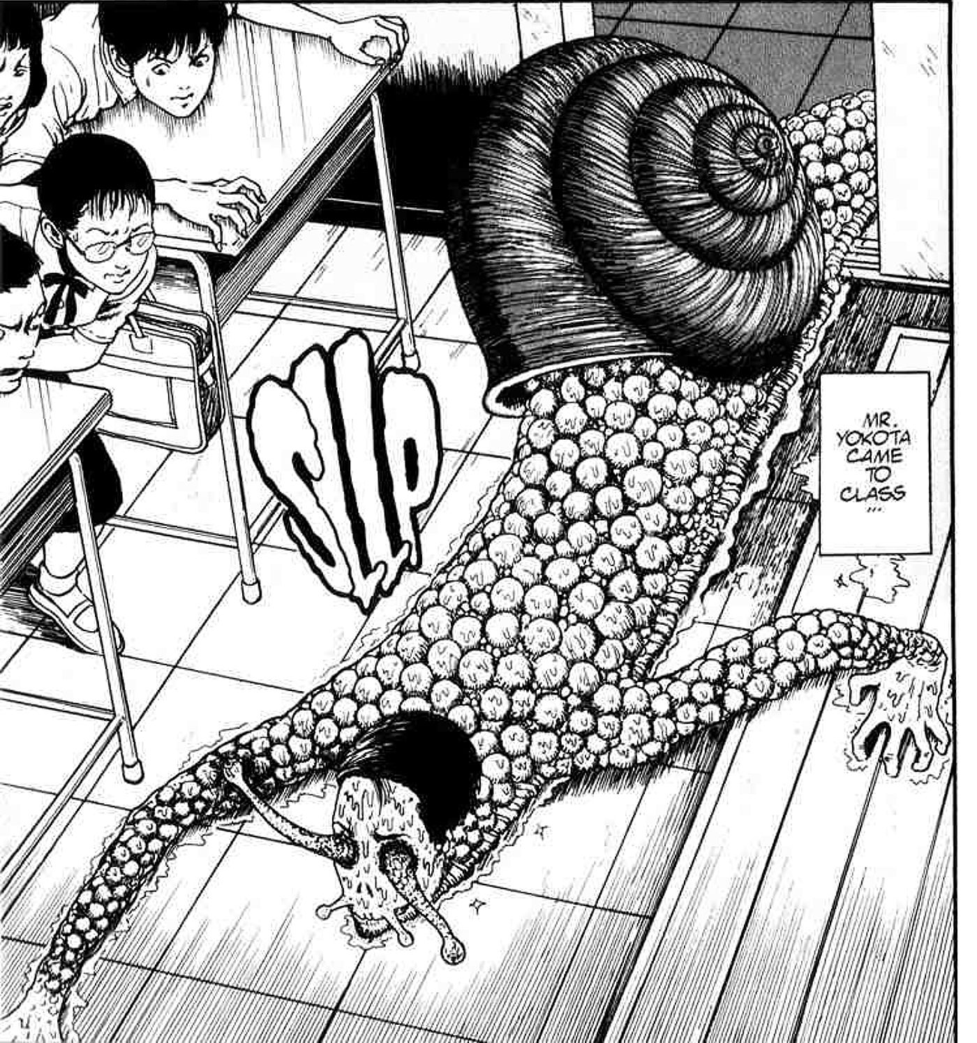 Este siguiente dibujo proviene de las páginas de una de las historias más conocidas de la épica y querida historia de Ito. Uzumaki. Este breve cuento, titulado El caracolse centra en un suceso misterioso en el que algunos estudiantes se convierten lentamente en caracoles.