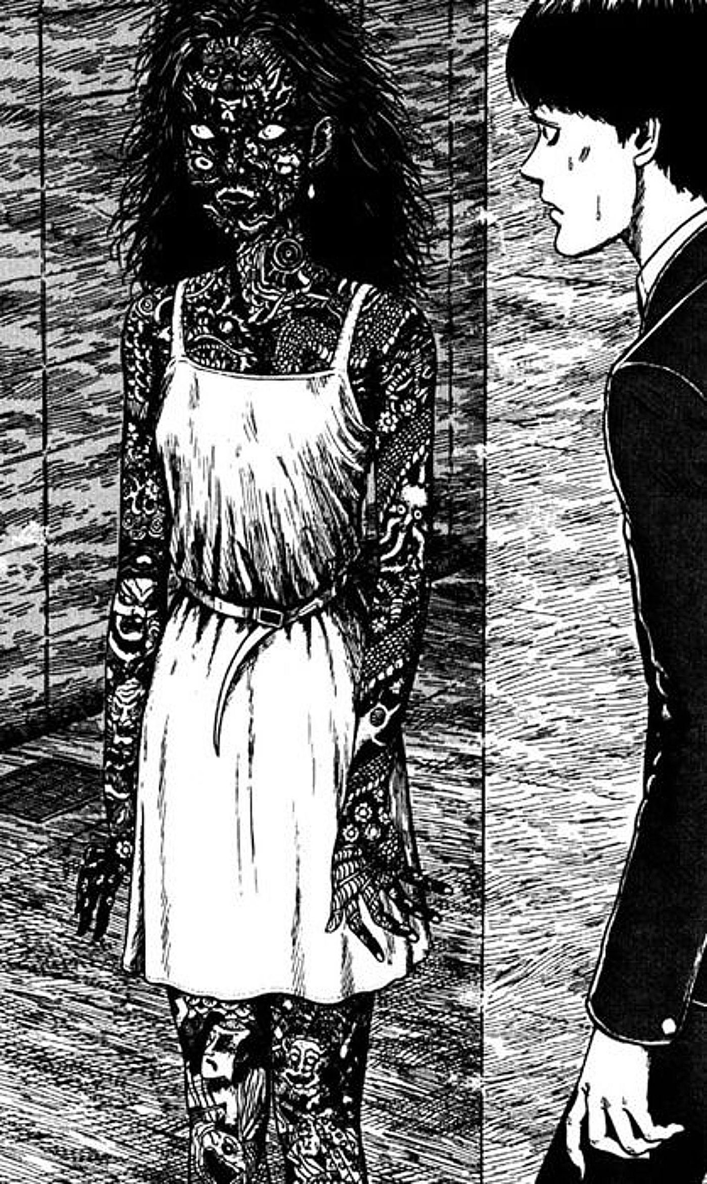 Esta inquietante obra de arte de Mal de amores: una mujer en apuros es Quizás la imagen más extraña que Ito haya hecho jamás.. La historia sigue a un niño llamado Ryusuke que se encuentra con una mujer durante un período de noches con problemas que empeoran. Después de mencionar que quiere hacerse un tatuaje una noche, emerge cubierta de ellos de pies a cabeza. La forma en que Ito diseña este look emite una vibra extraña y obsesiva. La forma es claramente humana, pero los tatuajes hacen que las cosas parezcan extrañas. Las formas de los animales y otras imágenes contorsionan partes de su cuerpo y hacen que ya no parezca humana. Sin duda, es una de las creaciones más espeluznantes de Ito que hace que la mente trabaje a toda marcha mientras intenta descifrar lo que está viendo.