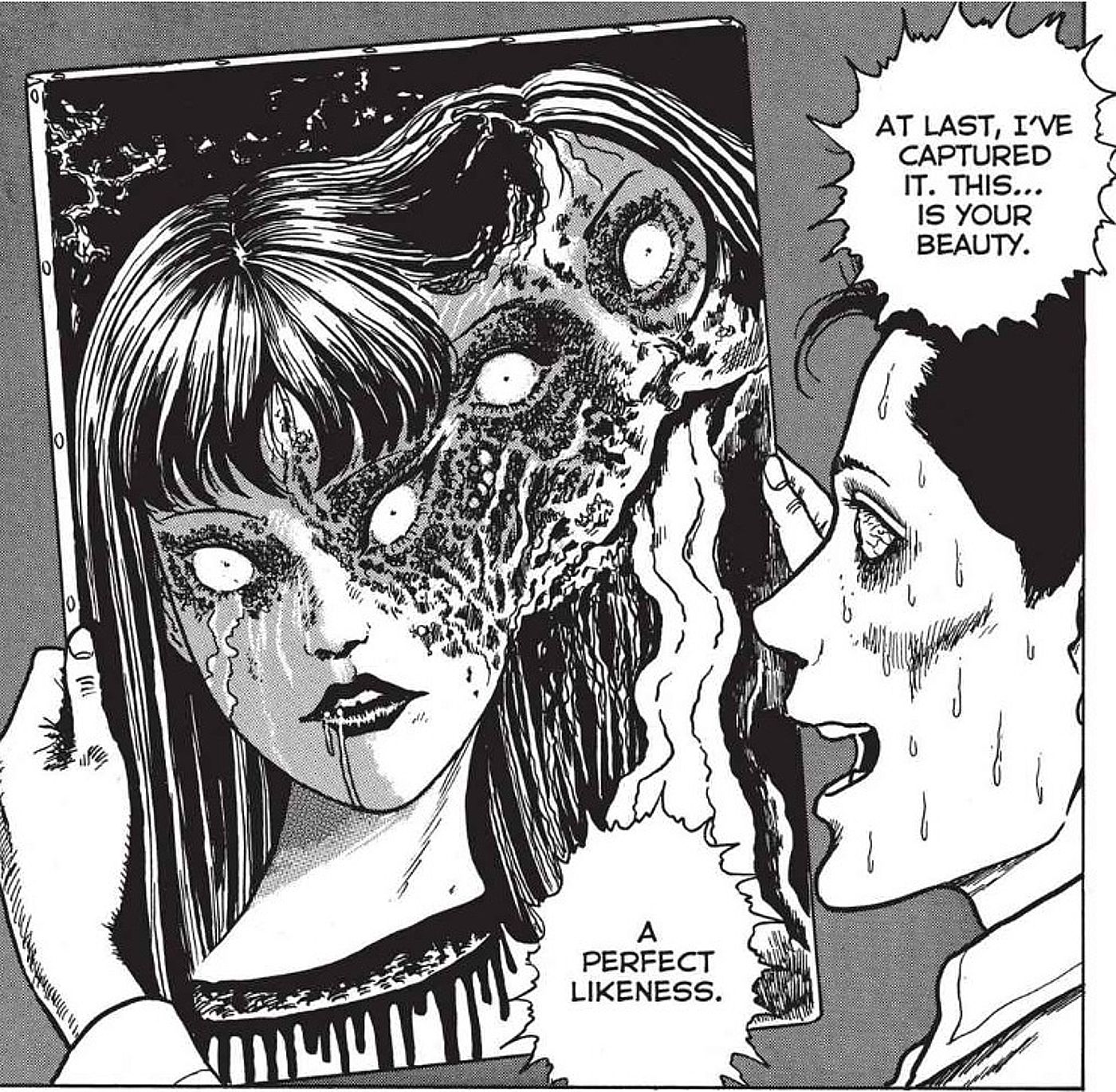 Esta imagen proviene de lo que sin duda es el La historia más famosa protagonizada por el icónico personaje Tomie de Ito.. Al igual que Souichi, Tomie se ha convertido en la mujer fatal recurrente de Junji Ito que aterroriza a Japón con su belleza y lleva a otros a cometer asesinatos. La historia Pintor ve a Tomie convertirse en la musa de una artista prometedora que quiere desesperadamente representar su belleza. Después de numerosos intentos fallidos de los que ella se rió, su obra maestra final muestra a Tomie en todo su esplendor con una horrenda segunda cabeza saliendo de ella. Se trata de una imagen tan inquietante que se ha convertido también en una de las interpretaciones más conocidas del personaje. Es una obra de terror bellamente diseñada que muestra que debajo de su belleza en el mundo real, se esconde un monstruo que llevará a otros a la locura.