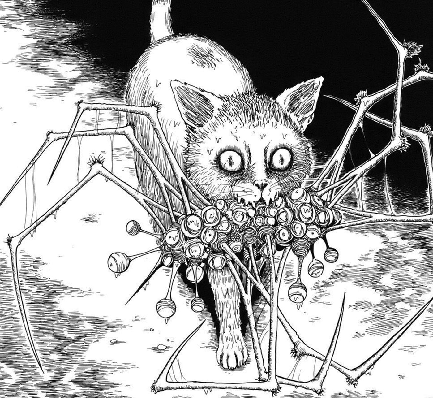 Esta combinación del estilo característico de Ito con un toque de horror lovecraftiano inicia esta lista de la mejor manera. Viniendo de la historia La querida mascota de Souichi, esta imagen muestra al gato de la familia maldecido por el infame villano Souichi de Ito mientras presenta una visión horrible. Souichi lo describe como “uno de esos insectos que viven en el infierno,” y la descripción que hace Ito de esto es demasiado compleja para que la mente pueda manejarla. La forma en que las patas del insecto se estiran con sus mil ojos es suficiente para revolver el estómago de cualquier lector. Puede que no sea increíblemente sangriento como algunos de los otros dibujos de Ito, pero El misterio detrás de esta criatura la convierte en una de sus creaciones más inquietantes..